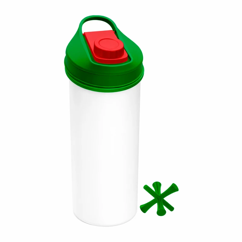 Cilindro de plástico sólido tricolor con pieza plástica para batir, tapa enroscable y asa. 25 x 7.5 cm.
