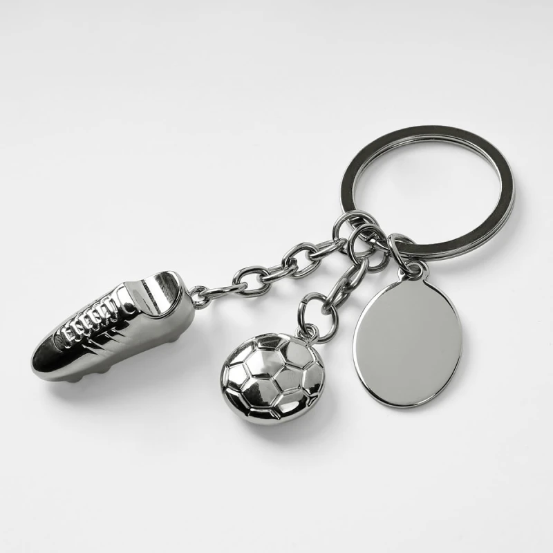 Llavero metálico de fútbol soccer. Incluye placa para grabado, 1 dije de zapato soccer y 1 dije de balón. 3.4 x 10.3 cm.