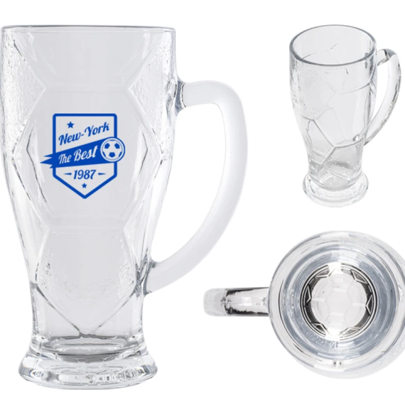 Tarro de vidrio para cerveza, con diseño de exágonos de balón de fútbol soccer. CAP. 420 ml. (14 OZ). 8 x 16.5 cm.